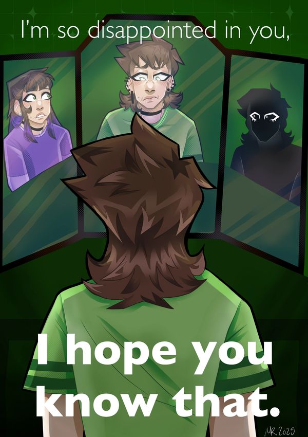 This drawing represents my internal disputes, sometimes feeling so bad about how I am and act, I feel disappointed. The young girl on the left in purple is younger me, and the silhouette on the right is future me. The middle character is how I present currently.