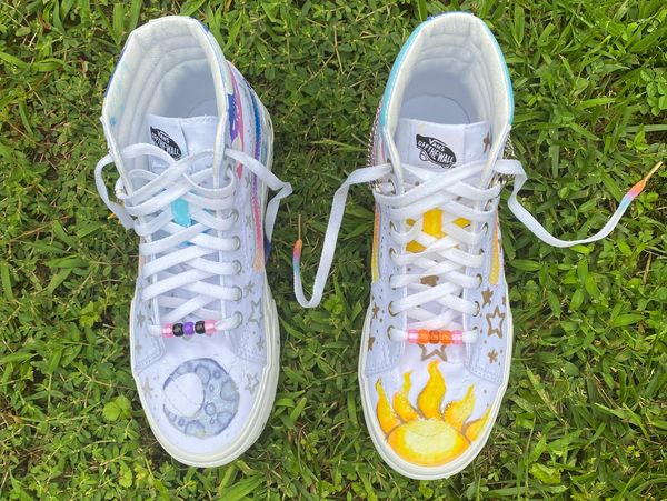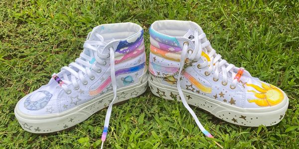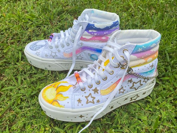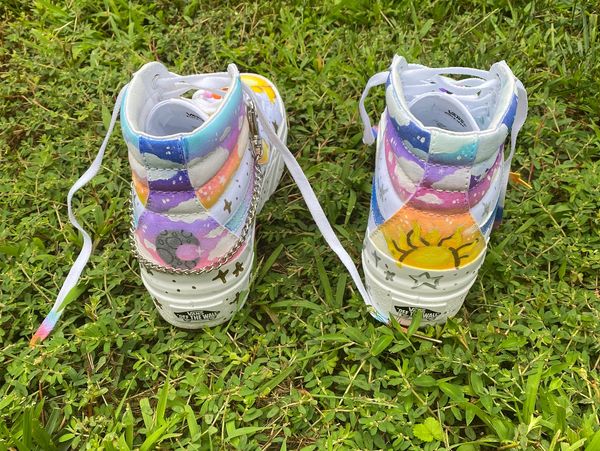 These shoes were decorated from white hightop vans, and painted with fabric markers and acrylic paint. Beads and chains were added afterwards.